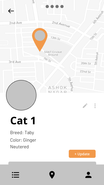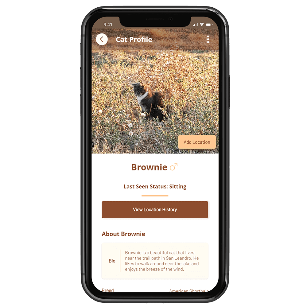 Users can view the detailed cat profile page of the cats they added in the app, including the last seen status of the cat. They can also edit the profile details of the cat or update their status here.
